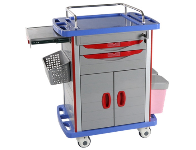 4、车体有放置锐器盒位置,配有污物桶,车体后侧配有伸缩输液架。