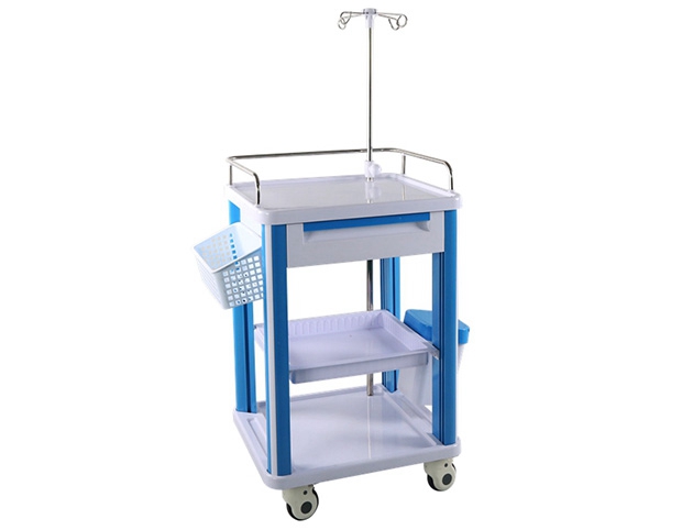品名:abs三层治疗车 型号:CT625H1 规格:625x475x920mm 1.主体材质采用铝·钢·ABS工程塑料结构组成;四柱塑钢; 2上部:不锈钢304材质三面围栏,凹陷设计可防止物品滑落,台面配有透明软玻璃; 3.车身配有一抽屉,抽屉内分成16格,3*3分隔片,可自由分隔; 4.车体底部尺寸:500*430,可放大量物品。抽屉下部两只旋转式污物桶。 5.毛重:25KG