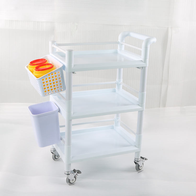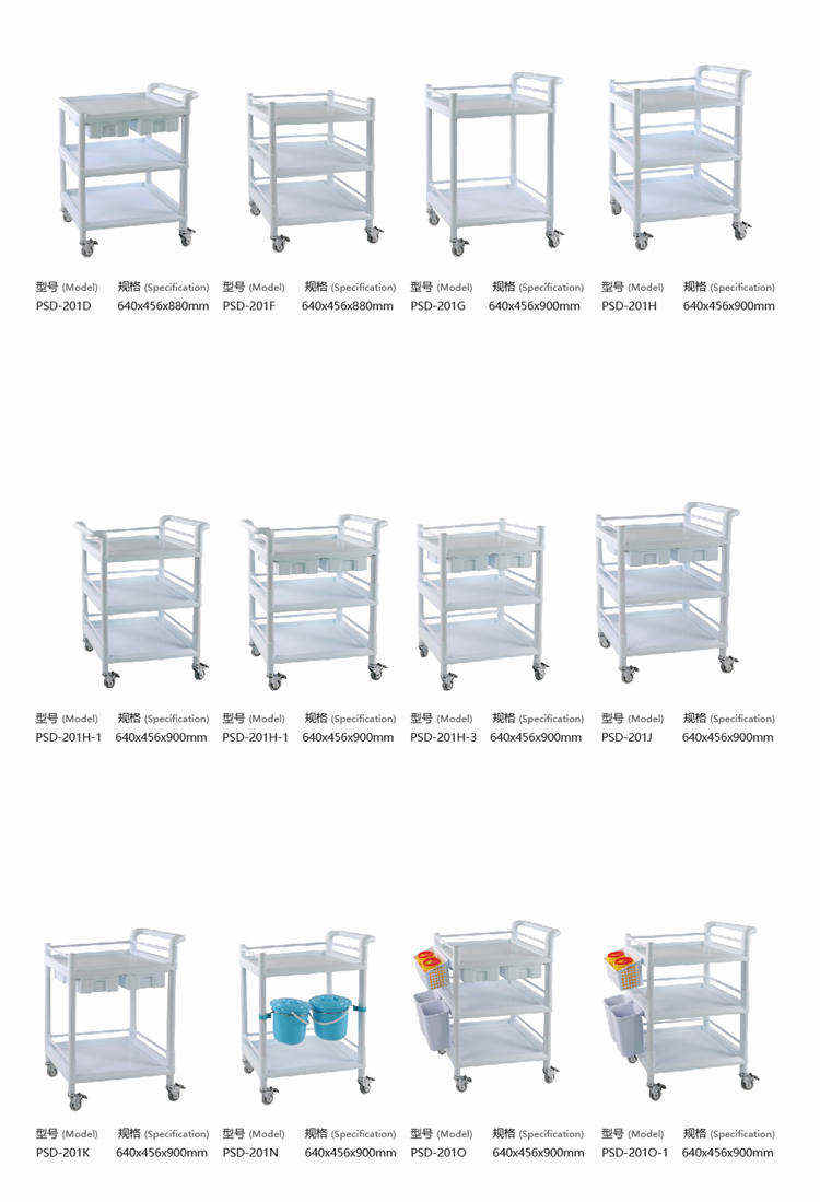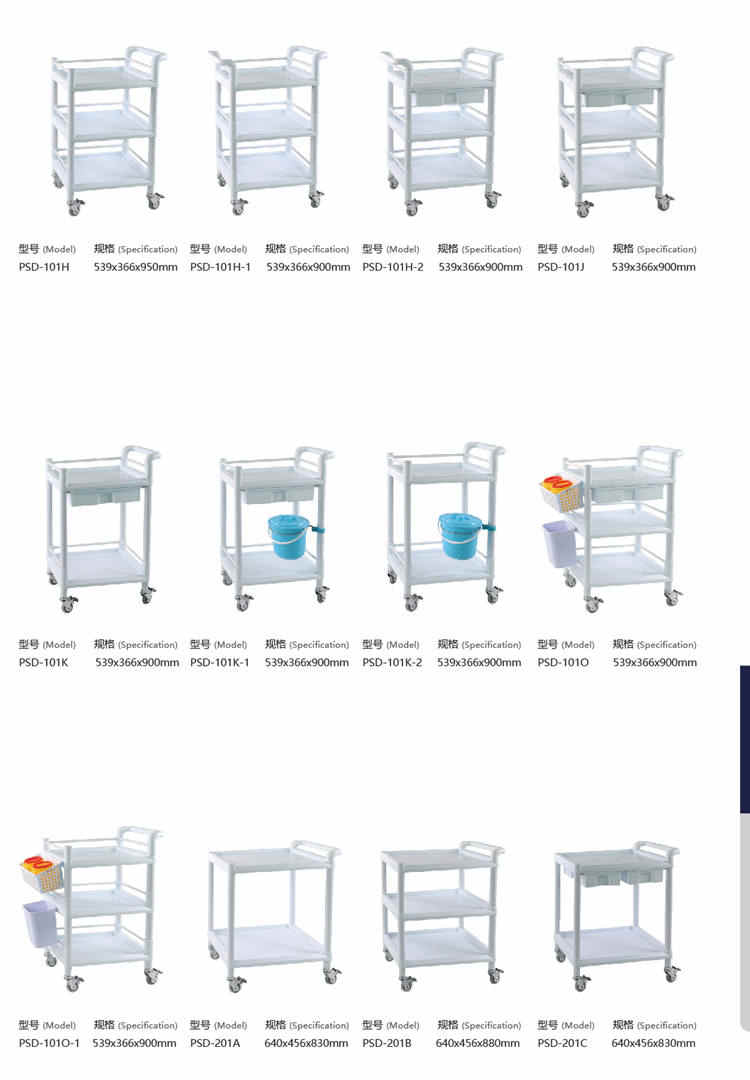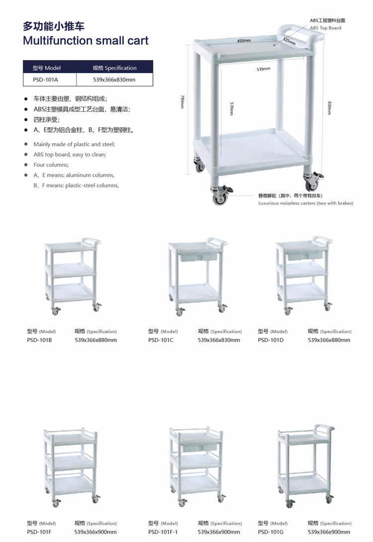多功能医用推车小号 型号:101O-1 车体尺寸: 长600*宽370*高830mm 台面尺寸:长539*366*830mm 台面凹陷尺450*325*15mm 全车体采用ABS塑钢材质,安全承重60KG 推动中安静无异音,减少对病患之干扰;不生锈,易清理; 实用于医院美容院多出用途,临床 送药、治疗、放监护仪,放心电图机,等等;可多款选择,二层、三层、甚至四层、五层根据医院非标订做 ;