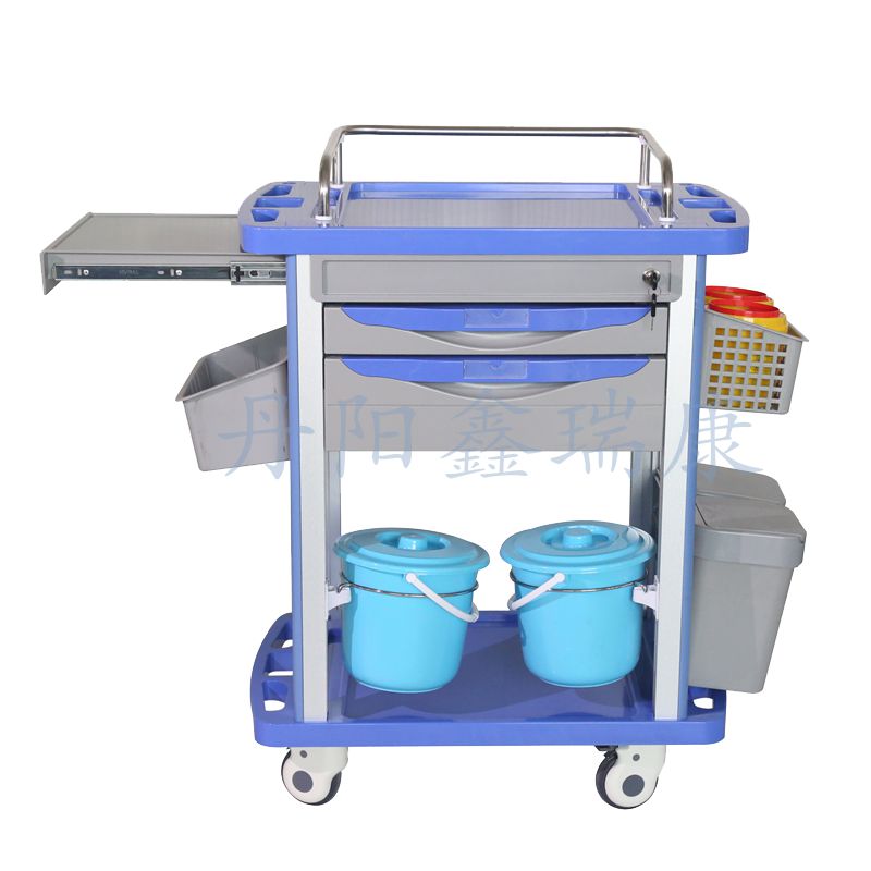 品名:双层双抽屉多功能治疗车 医用处置车 型号:CT625H4 配水桶 规格:750x80x920mm 1.主体材质采用铝·钢·ABS工程塑料结构组成;四柱塑钢; 2上部:不锈钢304材质三面围栏,凹陷设计可防止物品滑落,台面配有透明软玻璃; 3.车身配有两个抽屉,每个抽屉内分成16格(可增加),3*3分隔片,可自由分隔; 4.车体配两个污物桶。 5.毛重:35KG
