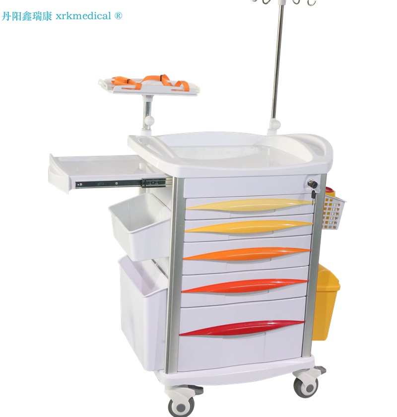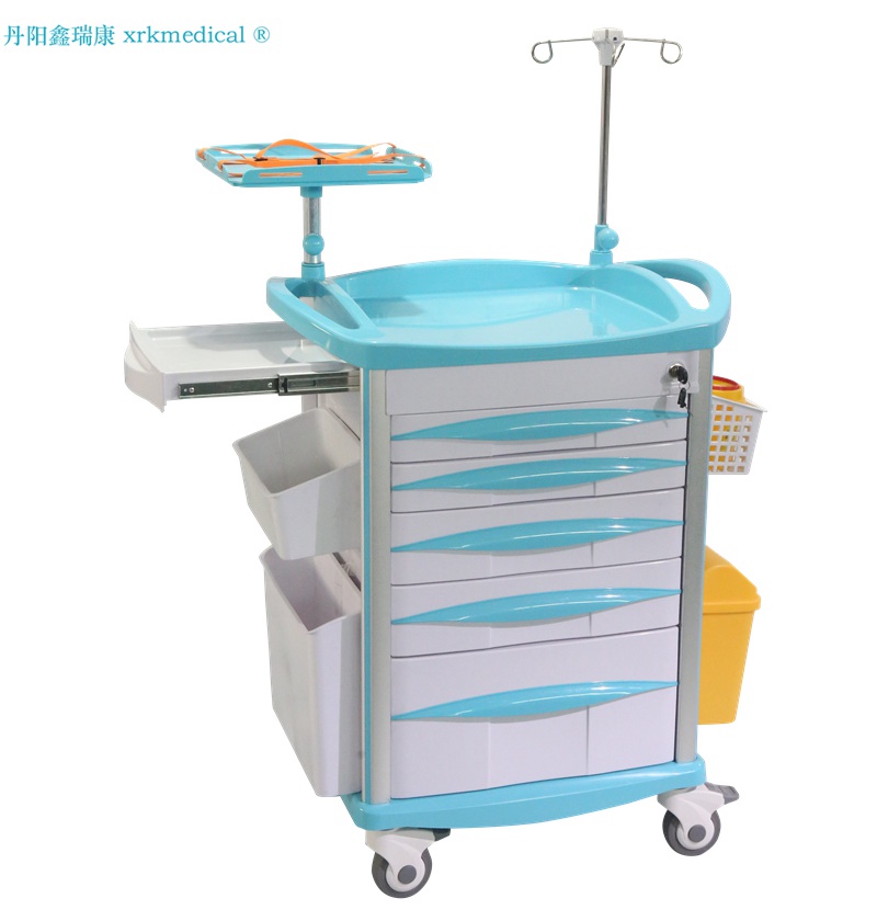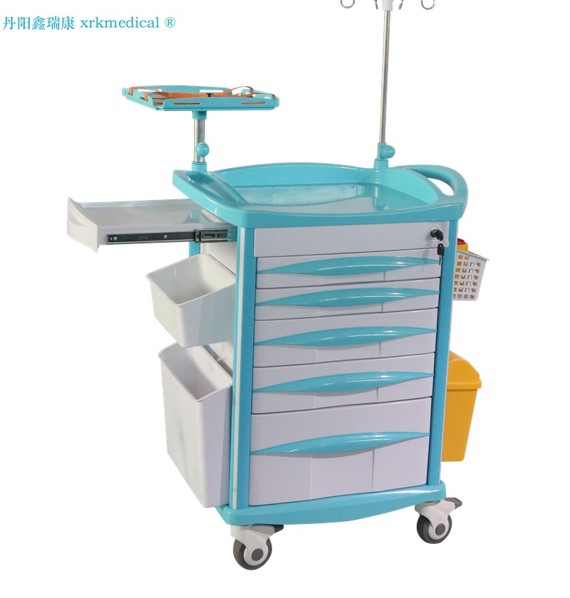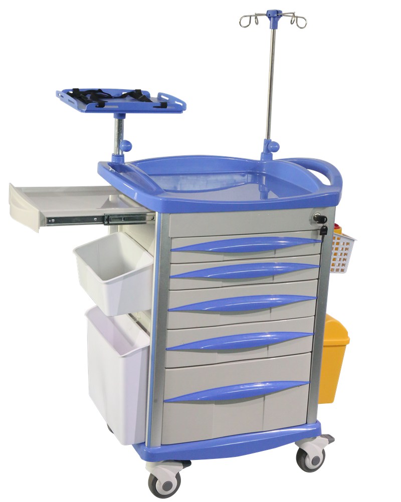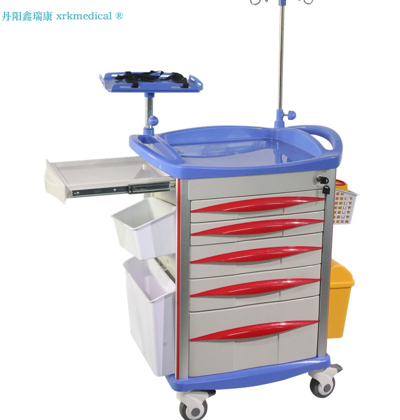 2.ABS双层底面注塑工艺成型两侧扶手台面,凹陷设计可防止物品滑落,台面上配透明软玻璃、除颤平台,隐形式副工作台,左右两侧各配一个花篮,配两只2L圆形锐气桶;两只摇盖式ABS污物桶方便存放垃圾; 3、升降输液架外杆,内杆Φ16,4个Φ6回旋;背面:除颤板上下托挂钩、5M电源插板、氧气瓶基座;