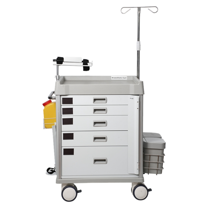 8 .整车配置五层抽屉,二只小号抽屉(高度80mm)、二只中号抽屉(高度120mm)、一只大号抽屉(高度230mm,每层抽屉配有移动式分隔板可根据要求自由移动组合,隔板的运用可帮助药物的分类