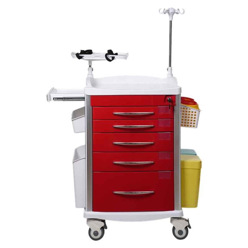 3、ABS双层底面注塑工艺成型台面,凹陷设计可防止物品滑落,台面上配透明软玻璃、除颤平台,隐形式副工作台,左侧资料盒,方便存放资料,左右两侧各配一个花篮,两只2L圆形专业锐器盒;两只ABS污物桶方便存放垃圾;