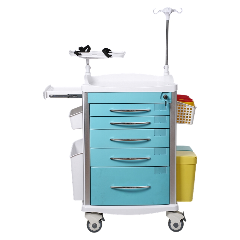 3、ABS双层底面注塑工艺成型台面,凹陷设计可防止物品滑落,台面上配透明软玻璃、除颤平台,隐形式副工作台,左侧资料盒,方便存放资料,左右两侧各配一个花篮,两只2L圆形专业锐器盒;两只ABS污物桶方便存放垃圾;