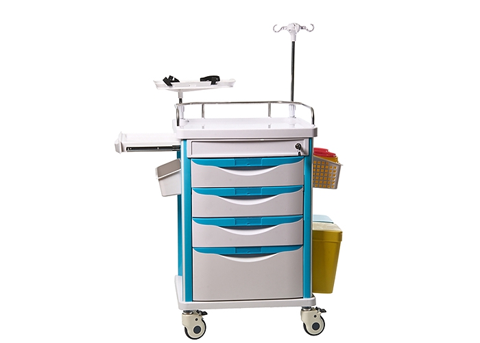3.ABS双层底面注塑工艺成型,凹陷设计可防止物品滑落,台面上配不锈钢护栏,透明软玻璃、除颤平台,隐藏式副工作台,左侧配一个置物盒,右侧配一个花篮,两只2L圆锐气桶;两只ABS污物桶方便存放垃圾;