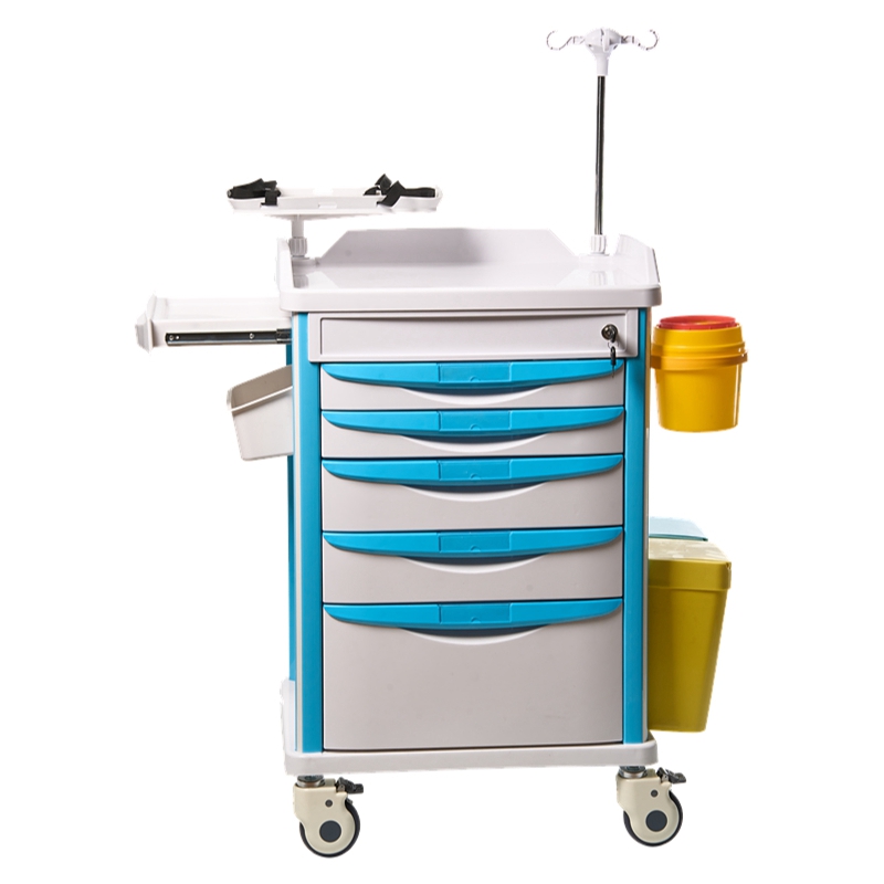 3.ABS双层底面注塑工艺成型,凹陷设计可防止物品滑落,台面上配不锈钢护栏,透明软玻璃、除颤平台,隐形式副工作台,侧边资料盒,方便存放资料,左右两侧各配一个花篮,两只2L圆锐气桶;两只ABS污物桶方便存放垃圾; 4、升降输液架外杆,内杆Φ16,4个Φ6回旋;背面:除颤板上下托挂钩、5M电源插板、氧气瓶基座;